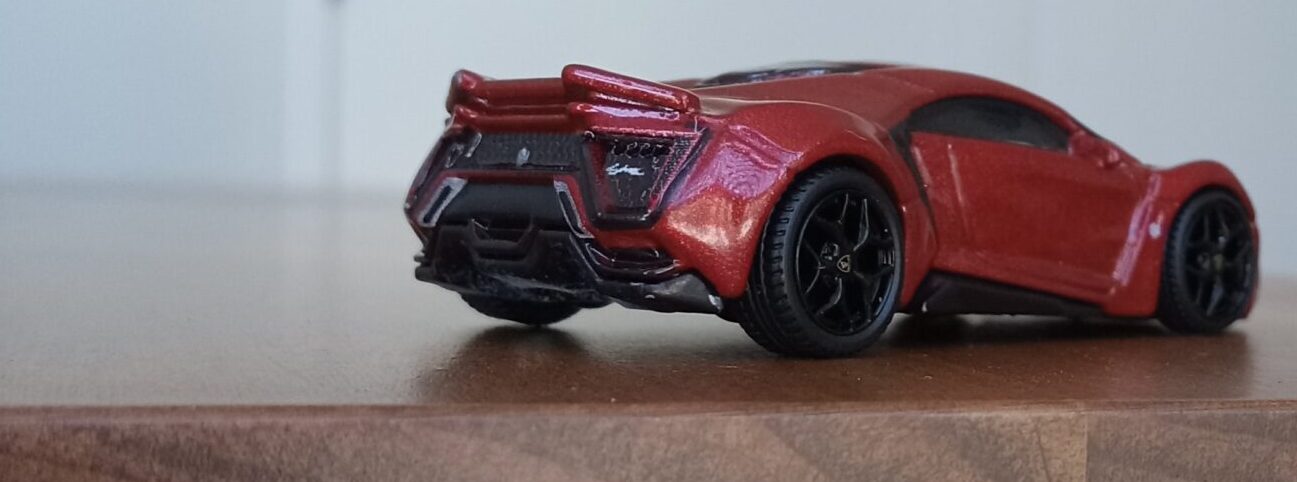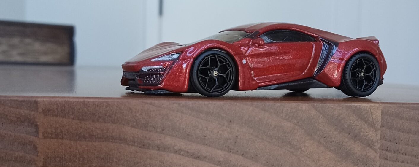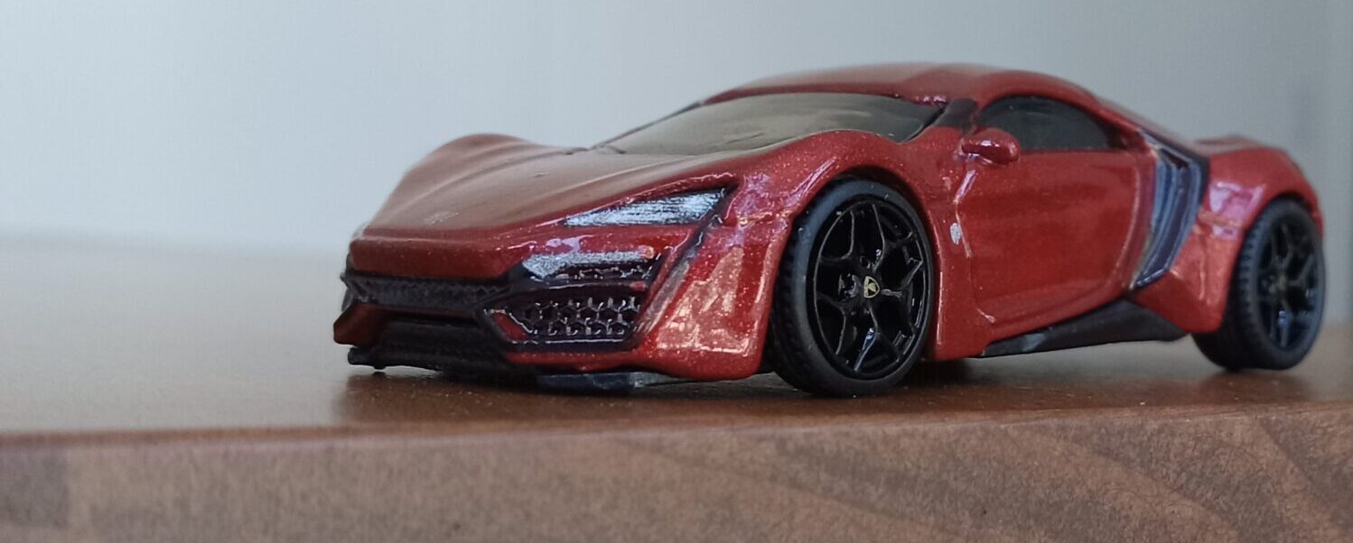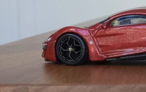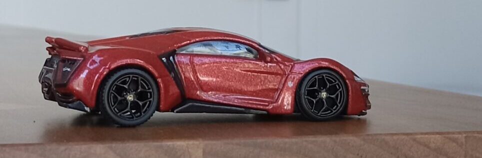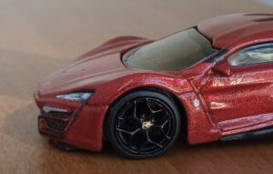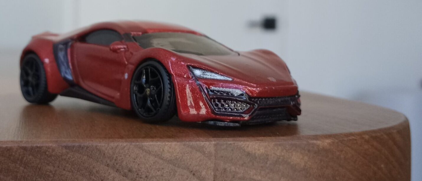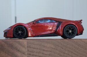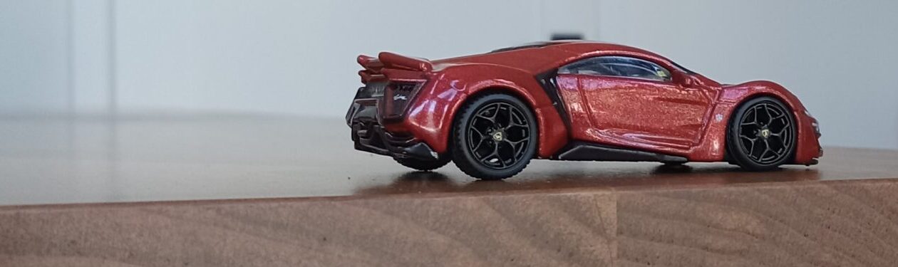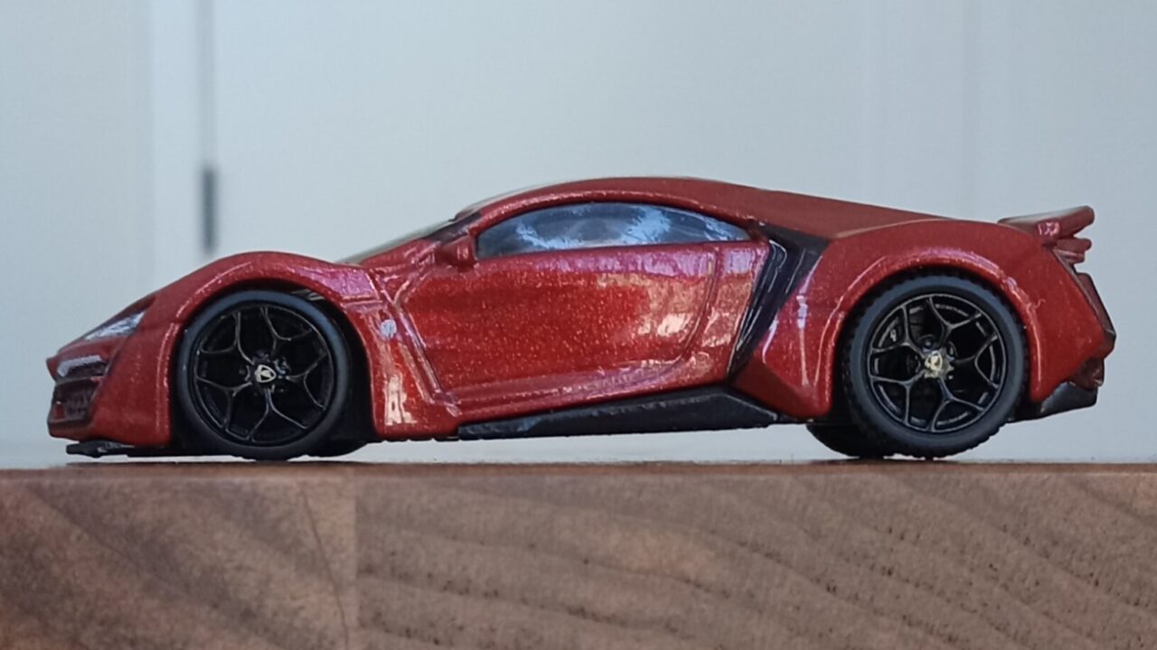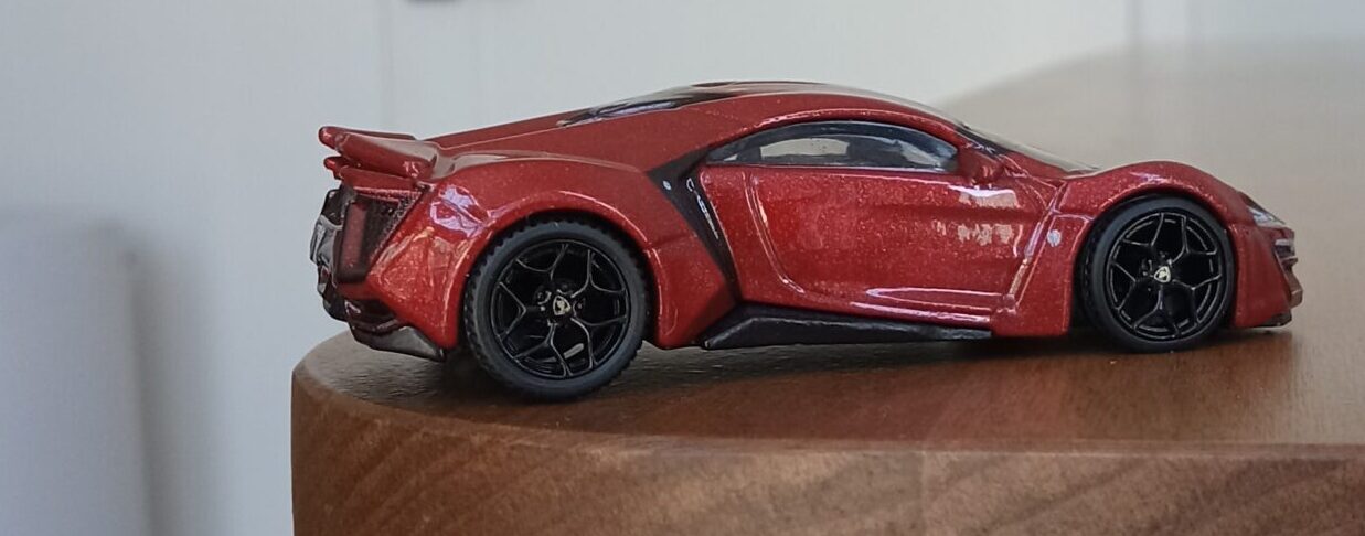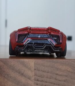 (⁂This time, while preparing photos, I swapped the tires/wheels from the [rear-tire-shabby, Mattel Hot Wheels version Lykan] with those from a MINIGT Lamborghini. I noticed that lowering the front tire position and raising the rear dramatically amplifies this design’s beastly intensity.
