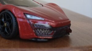 (⁂この度、写真撮影のため、【リアタイヤがショボい、マテル製ホット・ホイール版、ライカン】のタイヤ/ホイールをMINIGT製のランボルギーニのものに交換してみて気付いたのですが、フロントのタイヤ位置を下げ、リアを上げると、このデザインの猛獣度が爆上がりすることに気づきました。