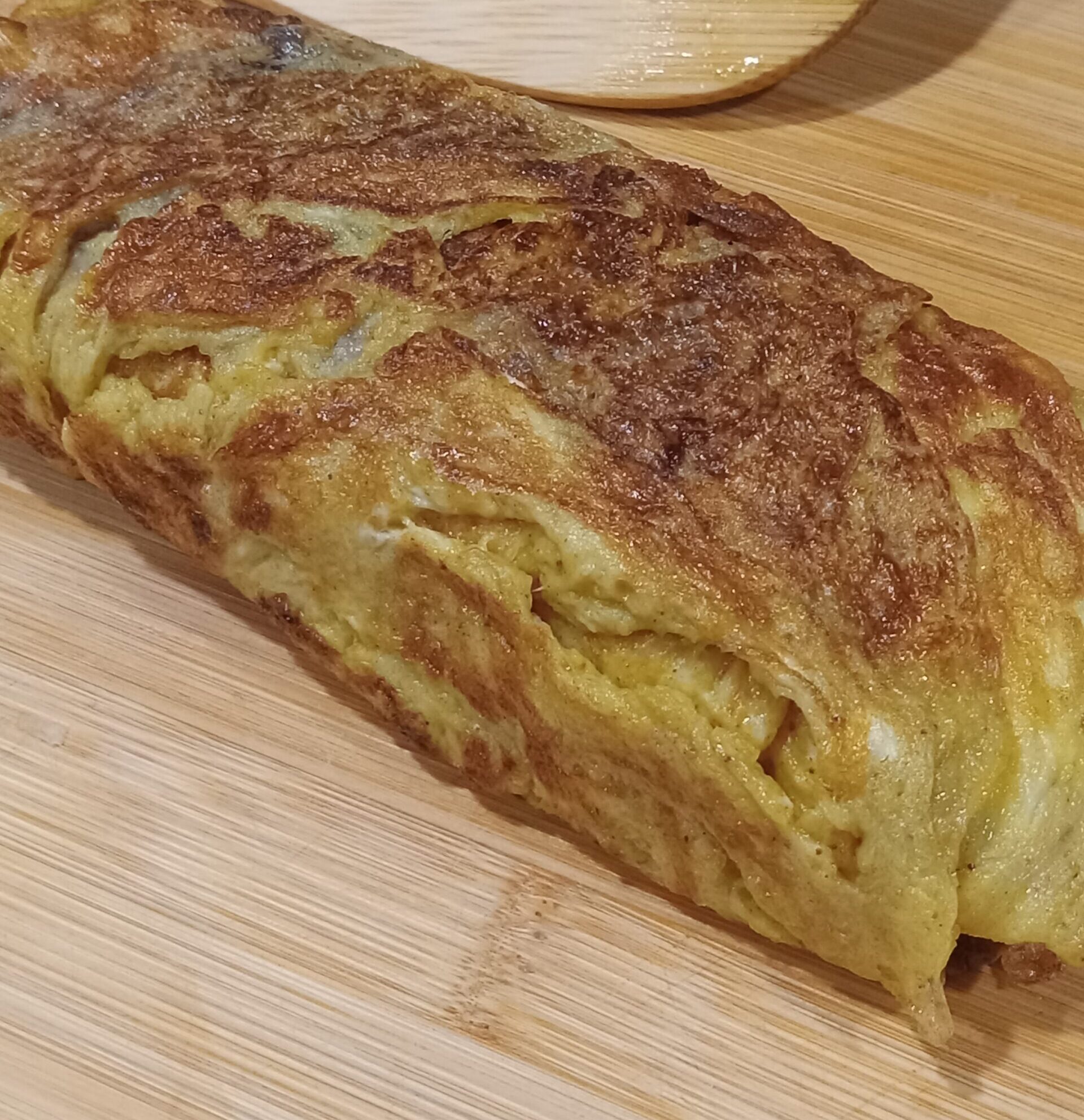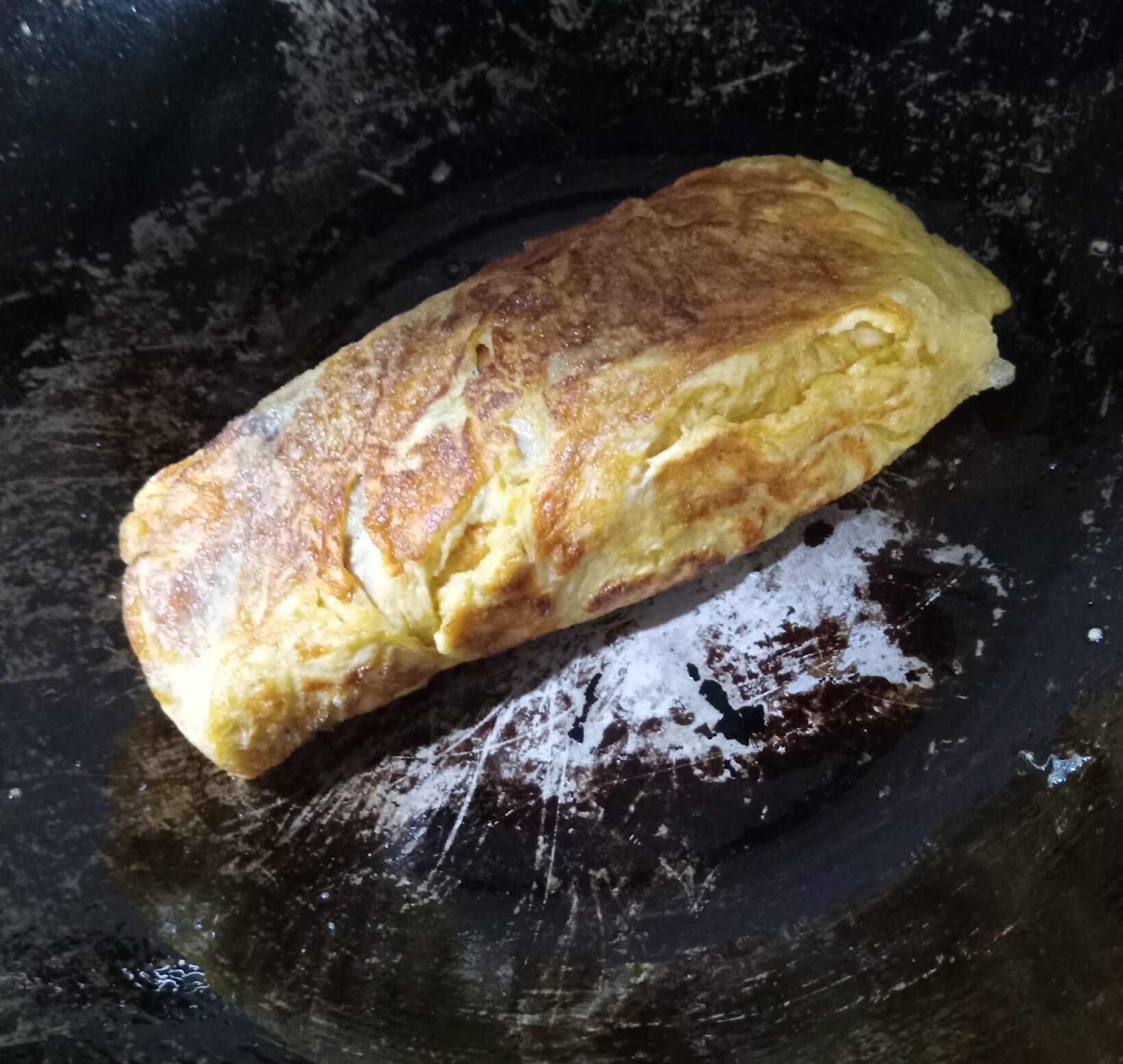 6,もう一度同じように巻き込み、最後に端の出っ張った部分をフライ返し2本を使って両側から押すようにして形を整えたら出来上がり。(更に弱火にしてフライ返しで断面が少し長方形になるように成型すると出来上がりの見た目が引き立ちます。)