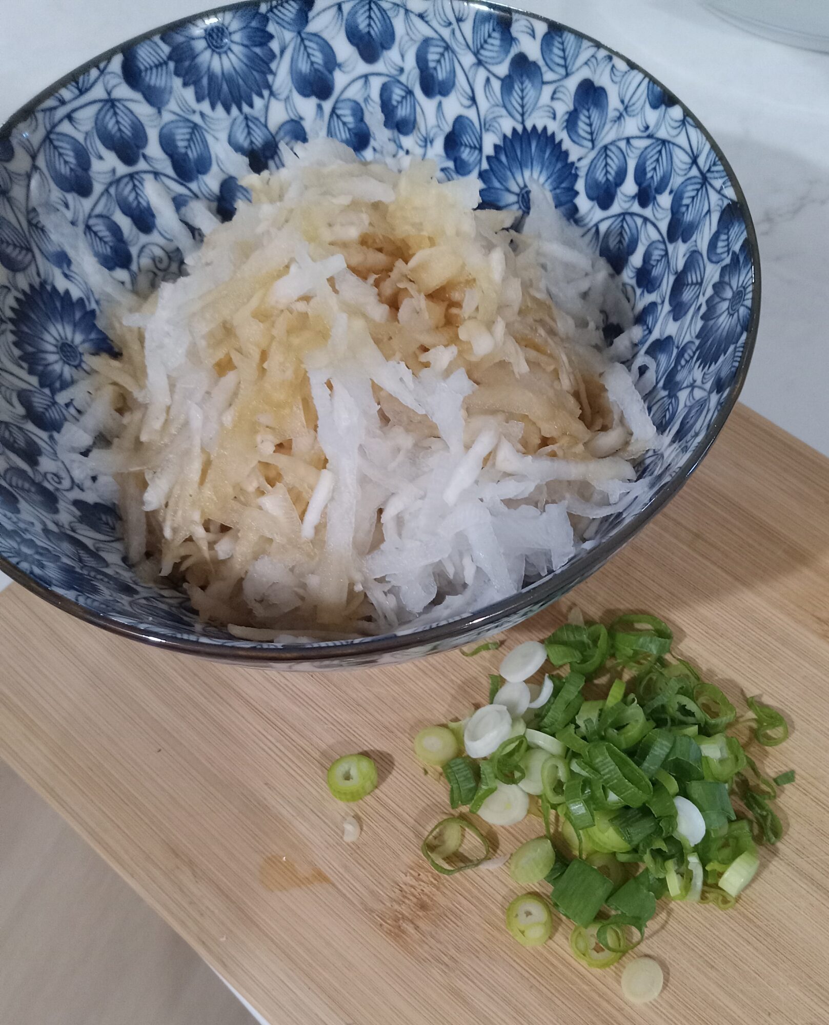 * Wash the daikon thoroughly, peel it, then coarsely grate it.