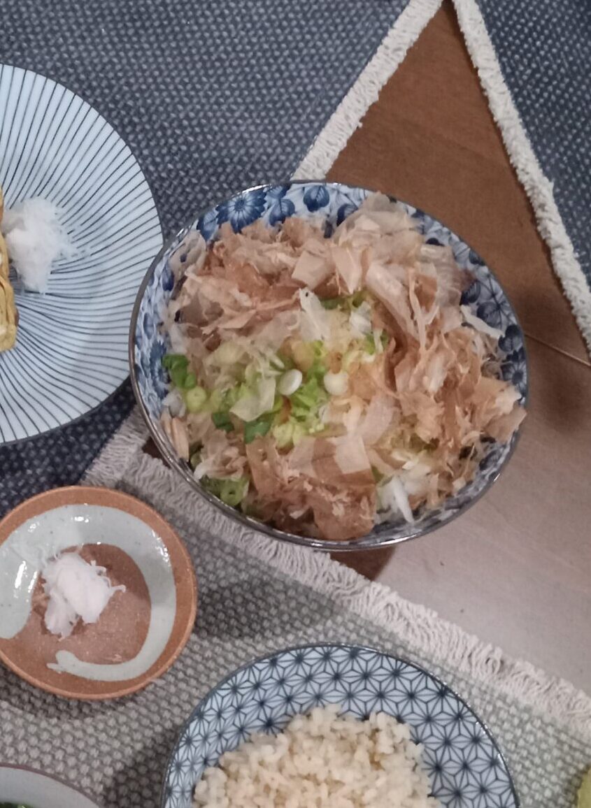 *鰹節、半量を軽くまぶして、残りの鰹節と長ネギをトッピングして出来上がり。