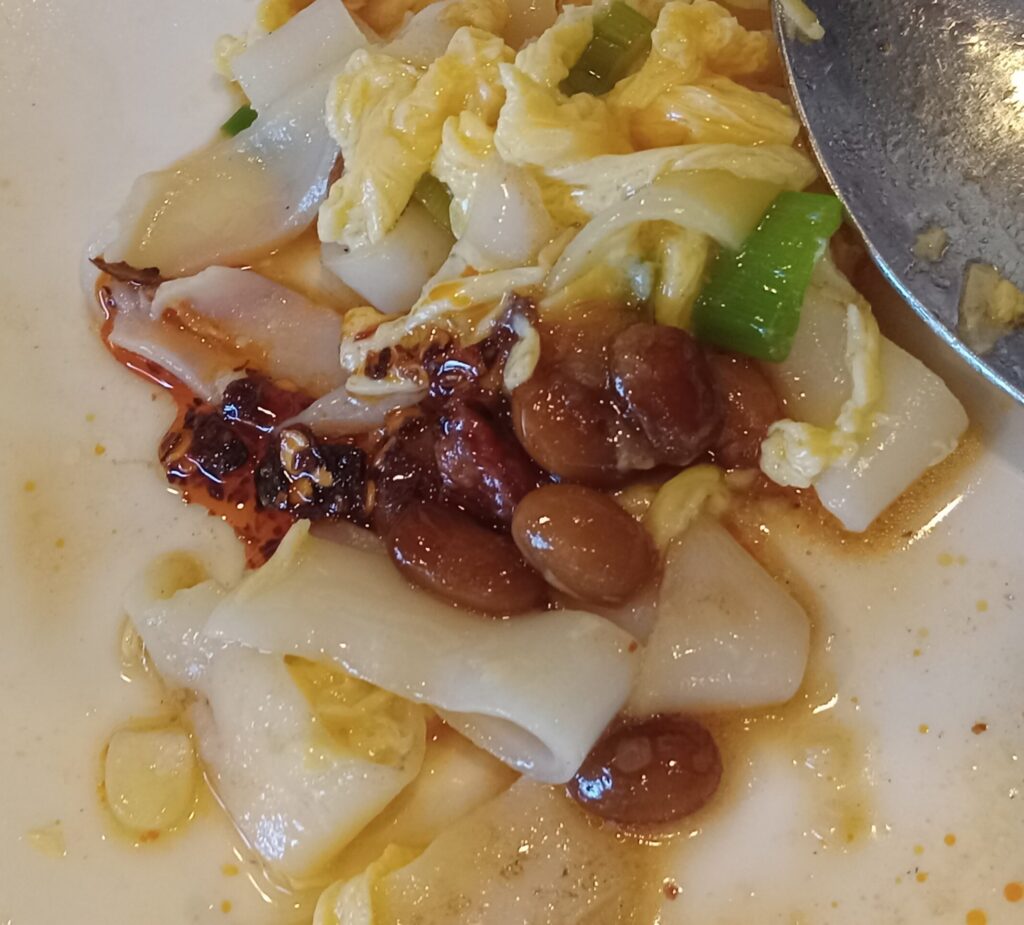 *Even more impressive is the proof of its stir-frying over high Chinese heat: unexpected charred bits clinging to the noodles, visible here and there. This slight bitterness provides the perfect accent, whether eaten alone or with all three dishes together, ensuring you never tire of it!!