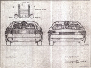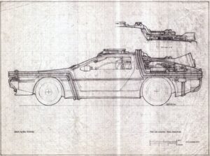 (This is the three-view drawing of the ‘BTTF’ time machine created by Ron Cobb)