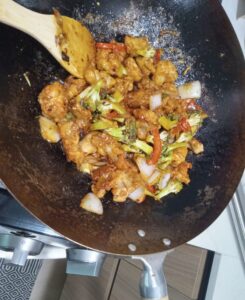 4. オーブンから取り出したカリッとした唐揚げ全部をドサッと投入、ソースを絡めながらさらに煮詰めます。(この煮ツメ工程が大切です。)