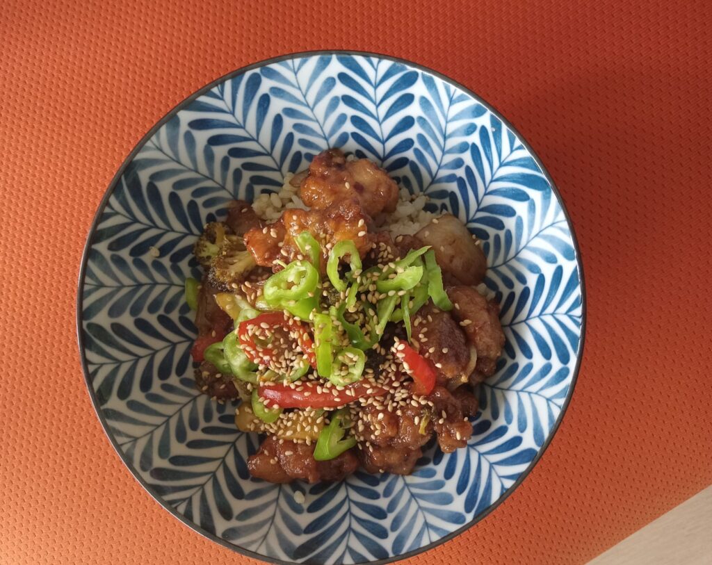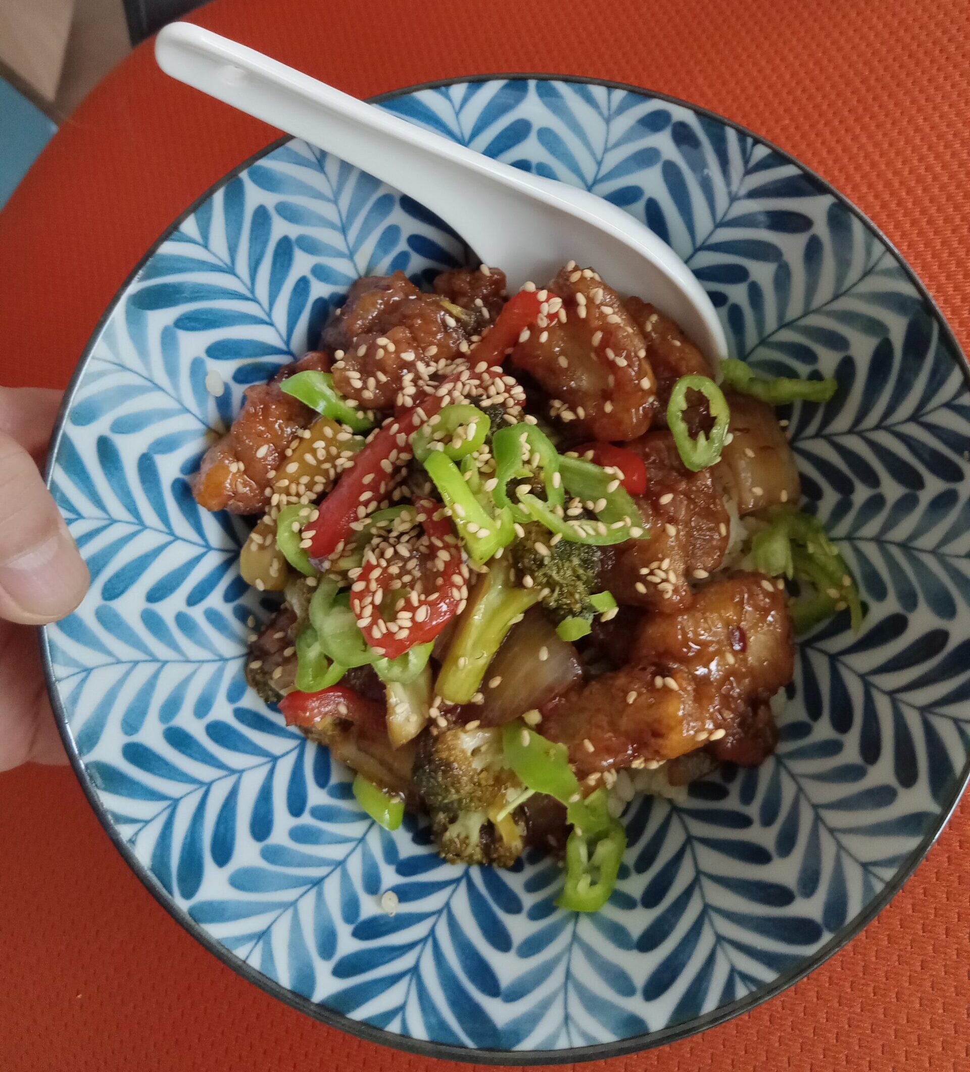 少しショウガが効いた唐揚げ、(外はカリッと中はジューシー)とオレンジジュースの甘酸っぱさが強力なアクセントとなり、御飯とのマッチングは酢豚以上でした。更に、私が勝手にあしらった玉ねぎの甘さと、ブロッコリーの歯ごたえと焦げ風味が丼物としての奥深さと「これ一品で満足」的な完結感を与えていました。