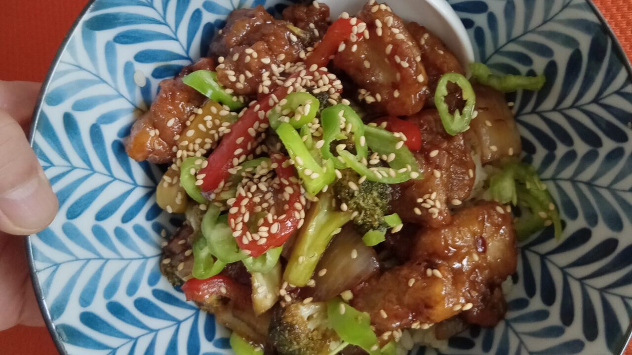 アメリカの中華料理屋さんで一番人気のメニュー:オレンジチキンです。唐揚げにしたチキン、玉ねぎ、野菜を甘辛ソースで絡めたお料理です。(ソースにオレンジのしぼり汁を加えるのでこの名前になってます。)