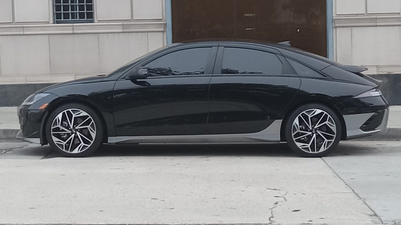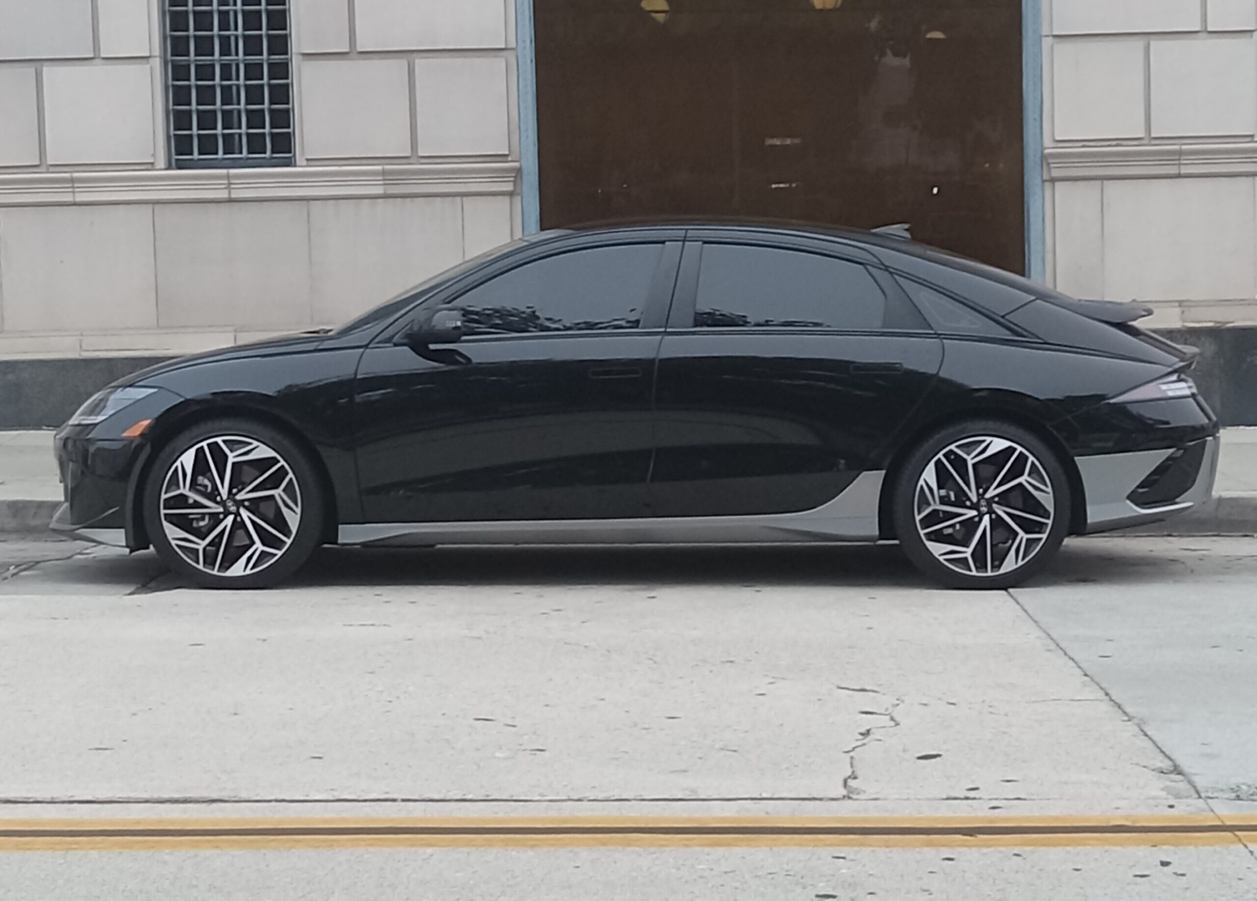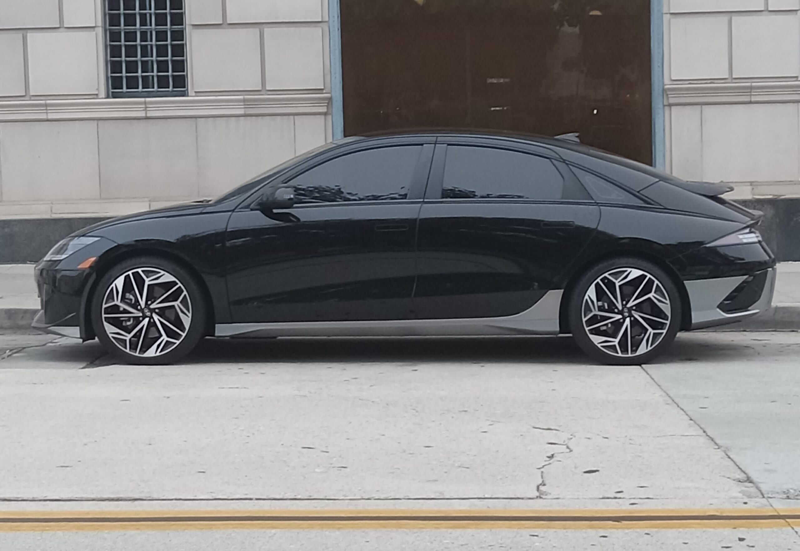 (패서디나 시청 근처 관청가에 자리 잡은 새까만 아이오닉 6의 사이드 뷰입니다.)