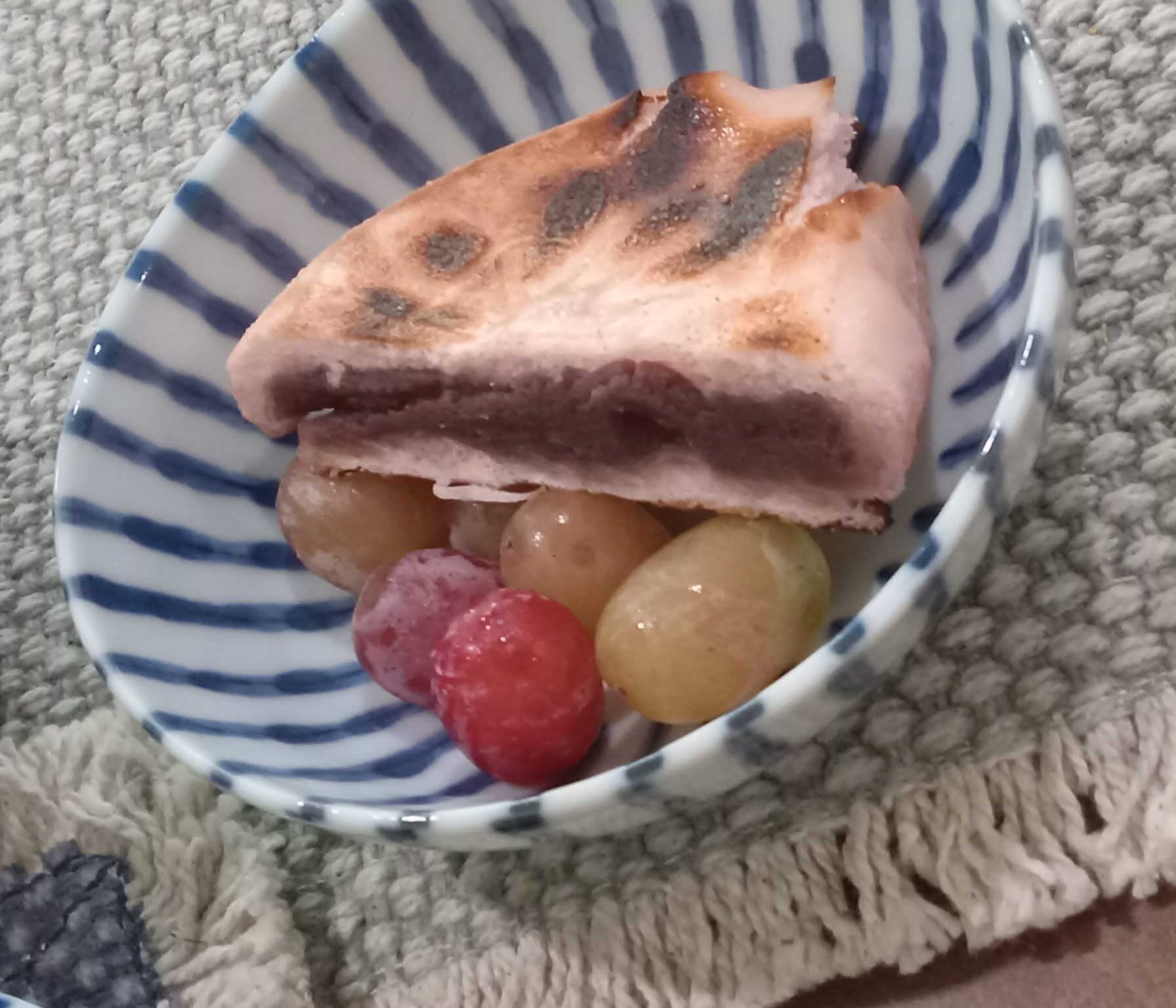 5、半分に切ってお皿にフルーツなどと一緒に盛り付け、出来上がり。
