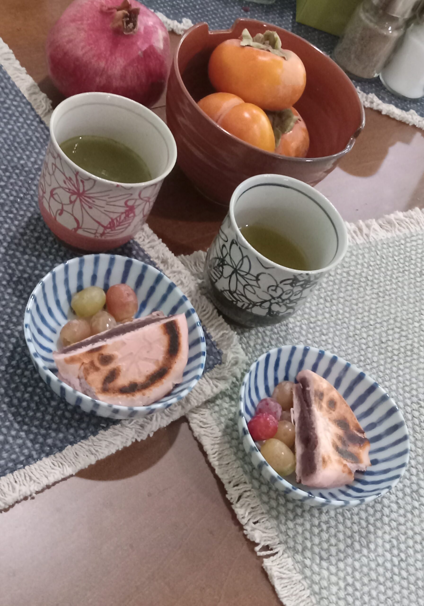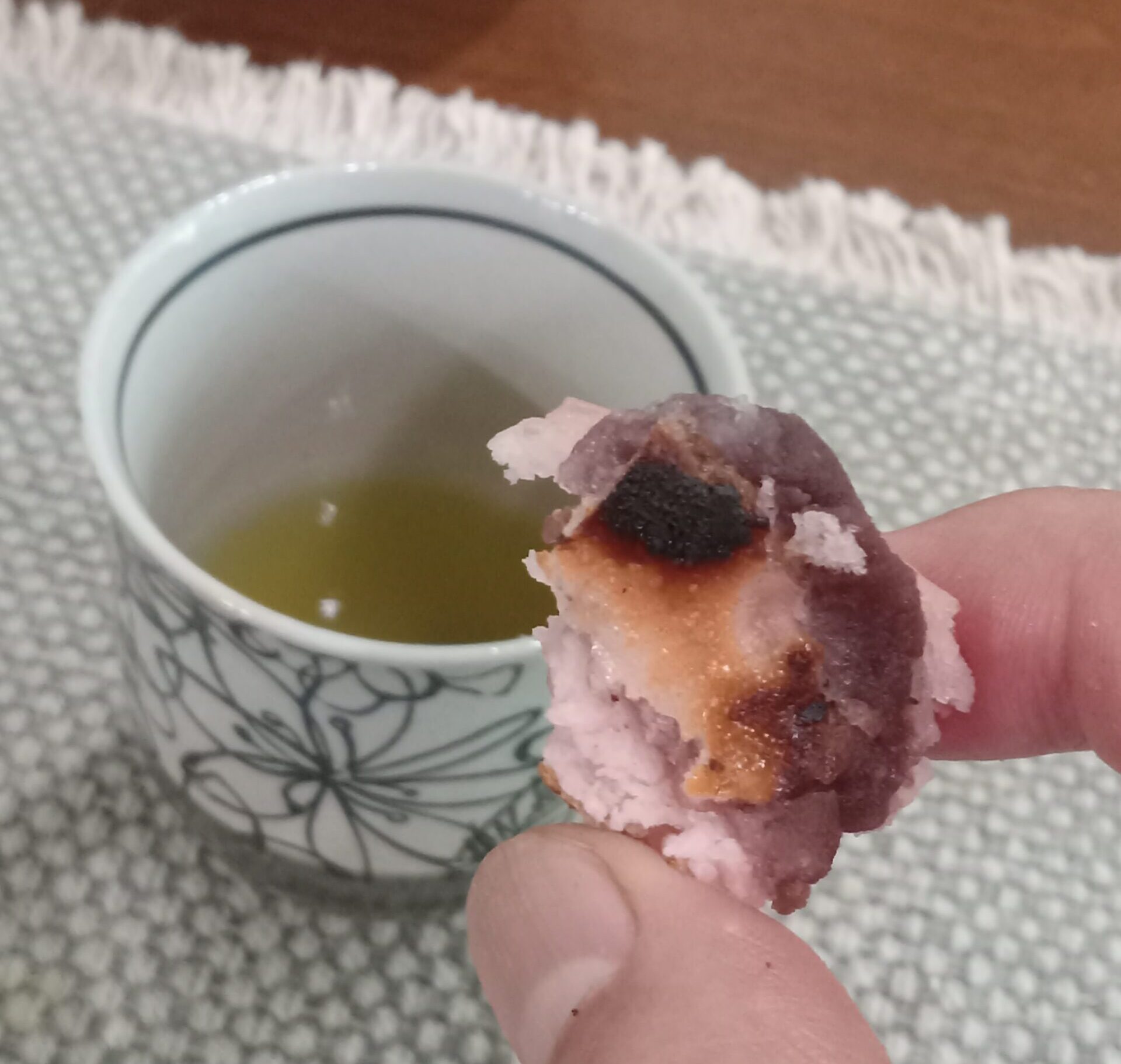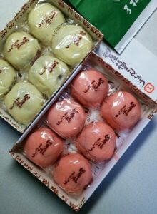 a pair of their famous ‘Amazake Manju’—one red, one white.