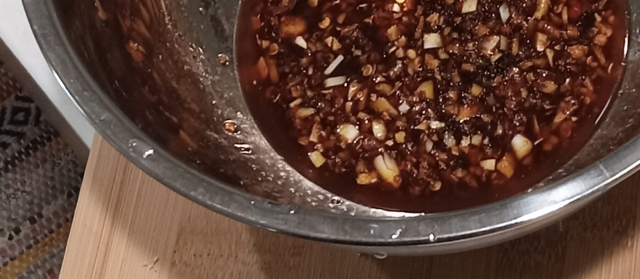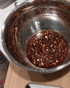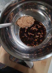 1、あらかじめ、ナムルの付けダレ用の材料を中サイズのボールの底で混ぜておきます。