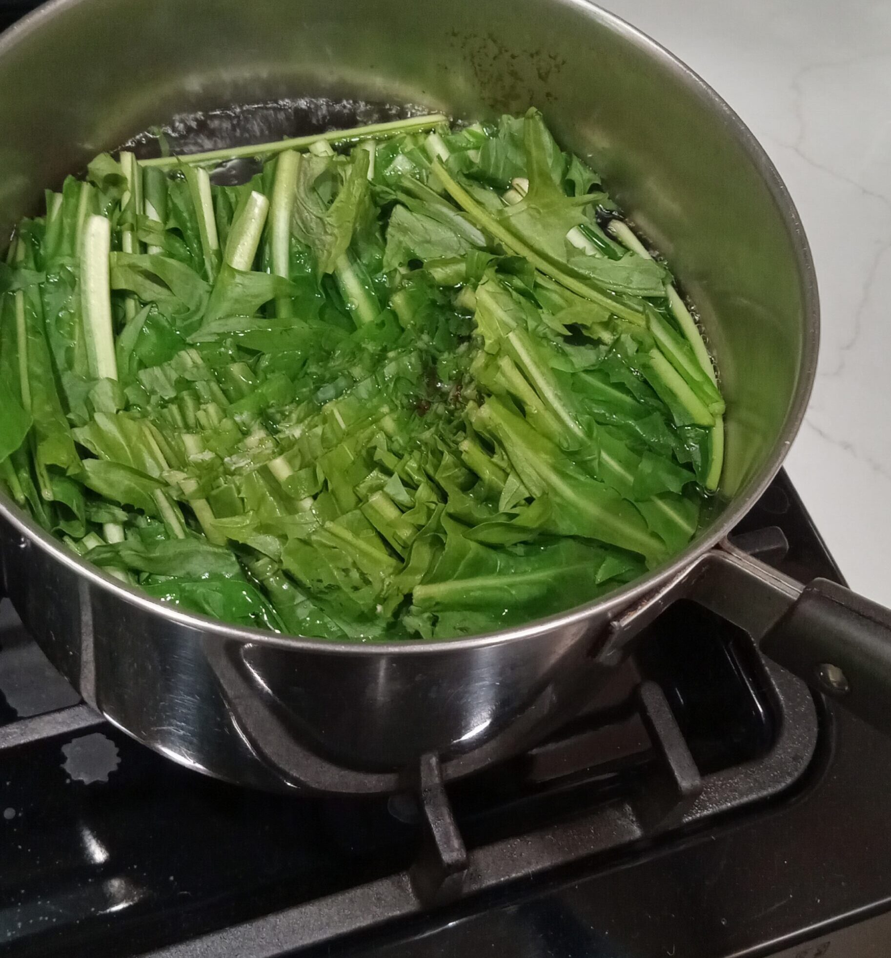 2. Bring a large pot of generous boiling water to a boil. Add the washed dandelion leaves, roughly chopped into quarters.