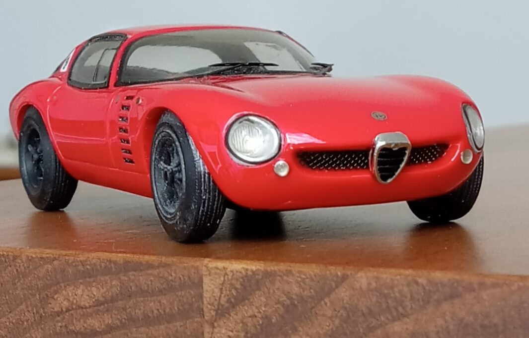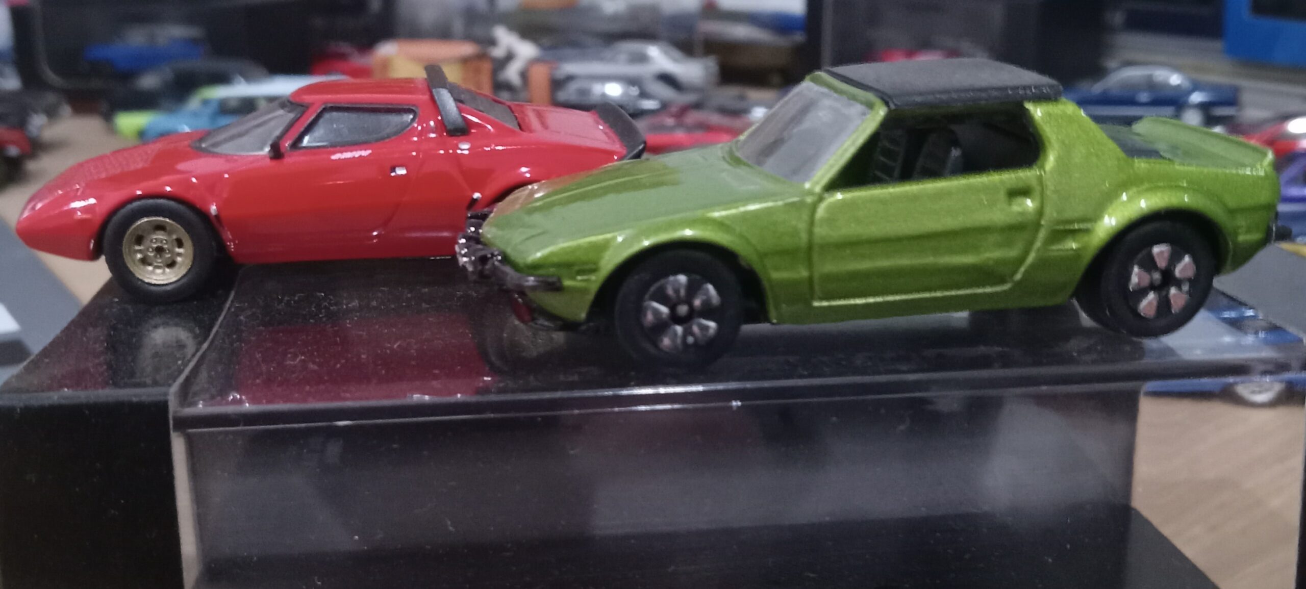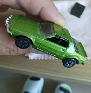 (コナミ製,1/64にダイドー製1/64のタイヤホイールを移植、車軸・フロントスポイラー部微調整の後、オミットされていたリアクオーターウインドウをかきもちのパケージ素材から目分量にて切り出し、何とか再現できました。最近ディアゴスティーニから出た1/64、出来が良さそうですがタイヤとホイールのバランスが今ひとつみたいですね、、、、)
