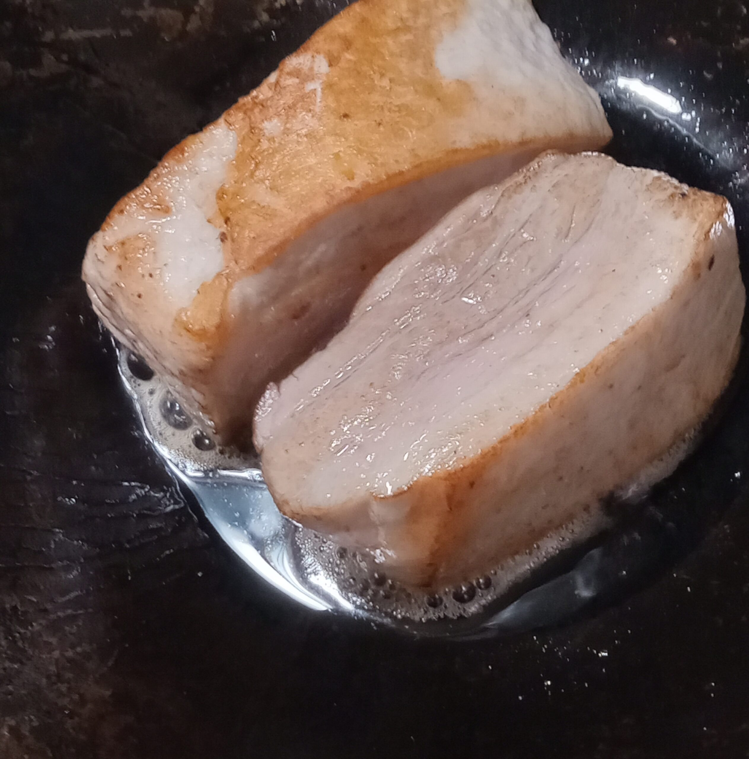 1、強火に熱したフライパンに、トングを使って豚バラ(2等分します)の6面すべてに焼き色を付け、(各面1-2分)