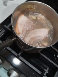 2、大き目のお鍋に湯を沸かし、豚バラ肉とざく切りにしたショウガ、ネギを加えて中火で30分湯で、お皿にとって冷ましておきます。