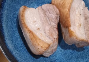 4、1cm弱に厚切りした豚バラ肉を、アボカドオイル大さじ1を熱したフライパンで焼肉の要領で片面3-4分づつ火を入れ少し焦がします、