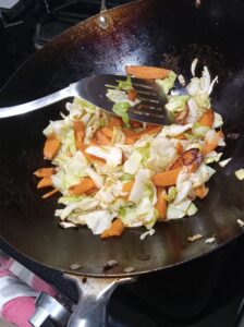 3、フライパンにアボカドオイル大さじ2を入れ、中火でキャベツ、ニンジン、の順で7-8分炒めてボールにとり置きます。