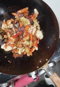 6、とり置いてあった野菜、パプリカ、黒豆チリソース、豆板醤を投入して、2-3分強火で炒め、最後に、四川山椒とみじん切りのリーク又は万能ねぎを入れ、さらに2分炒めたら出来上がり。(豆板醤の量で、塩辛さを調整してください。)