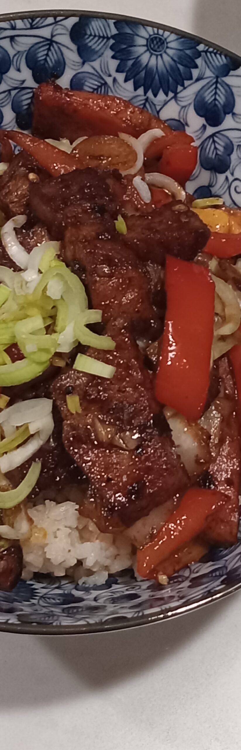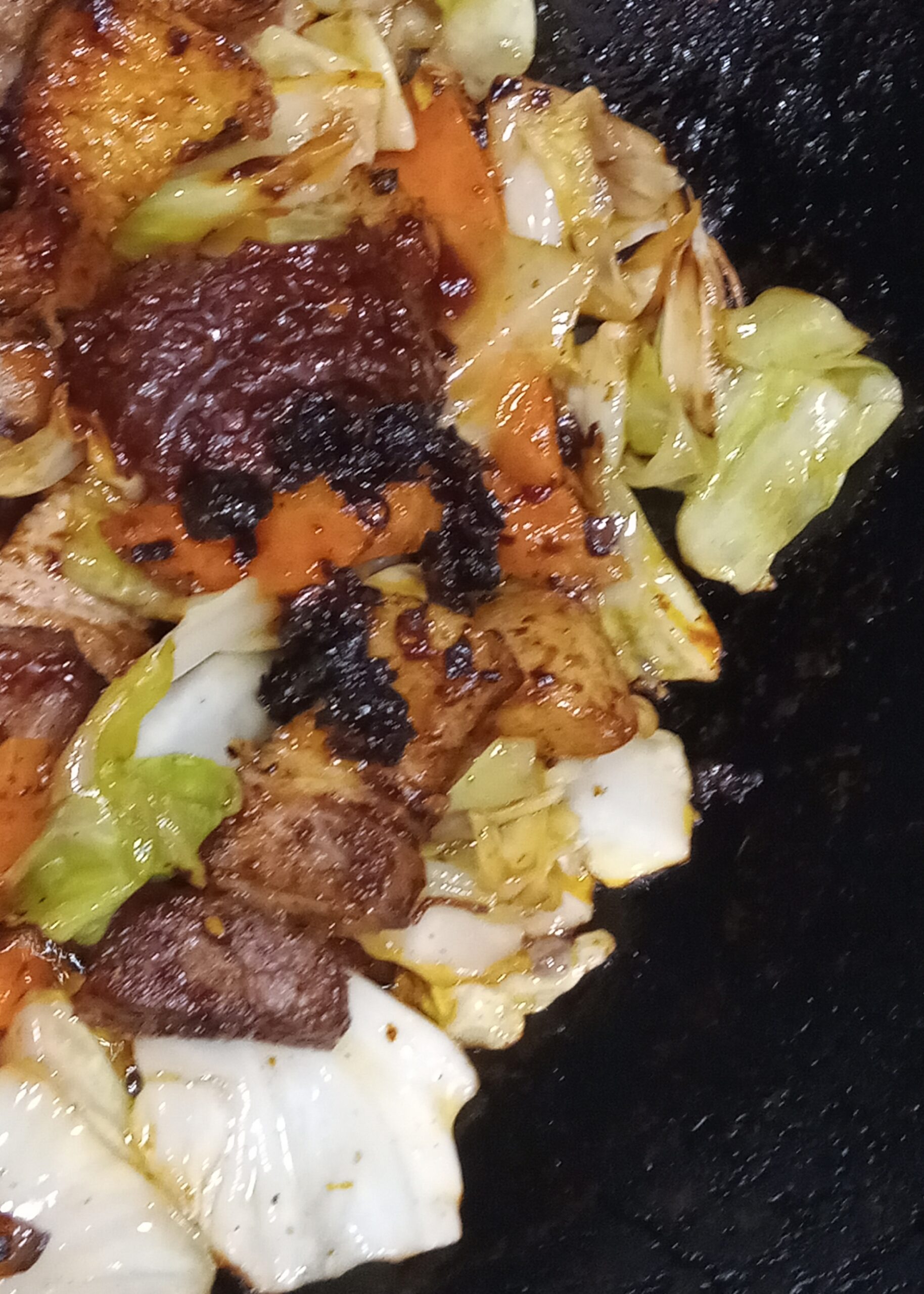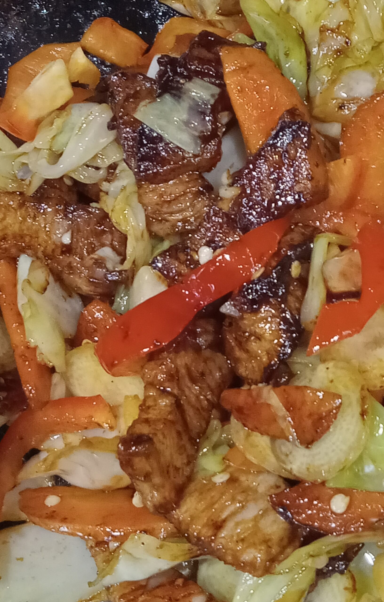 (It was thinly sliced pork belly stir-fried with cabbage and bell peppers in a sweet-spicy miso sauce.)