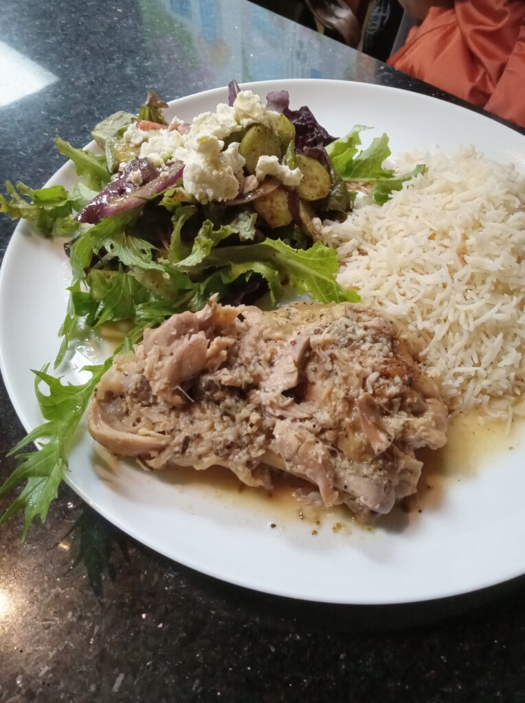 *Spiced oven-baked chicken (side: Greek salad, pilaf).
