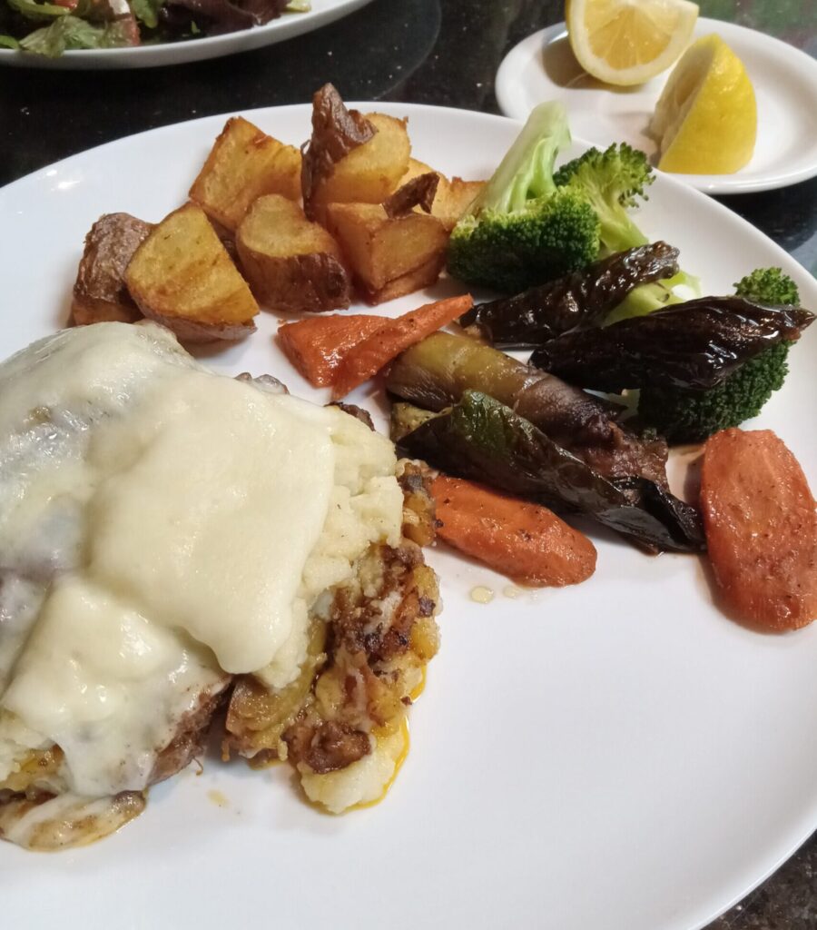 *Beef moussaka (side: oven-baked vegetables, seasonal potatoes),