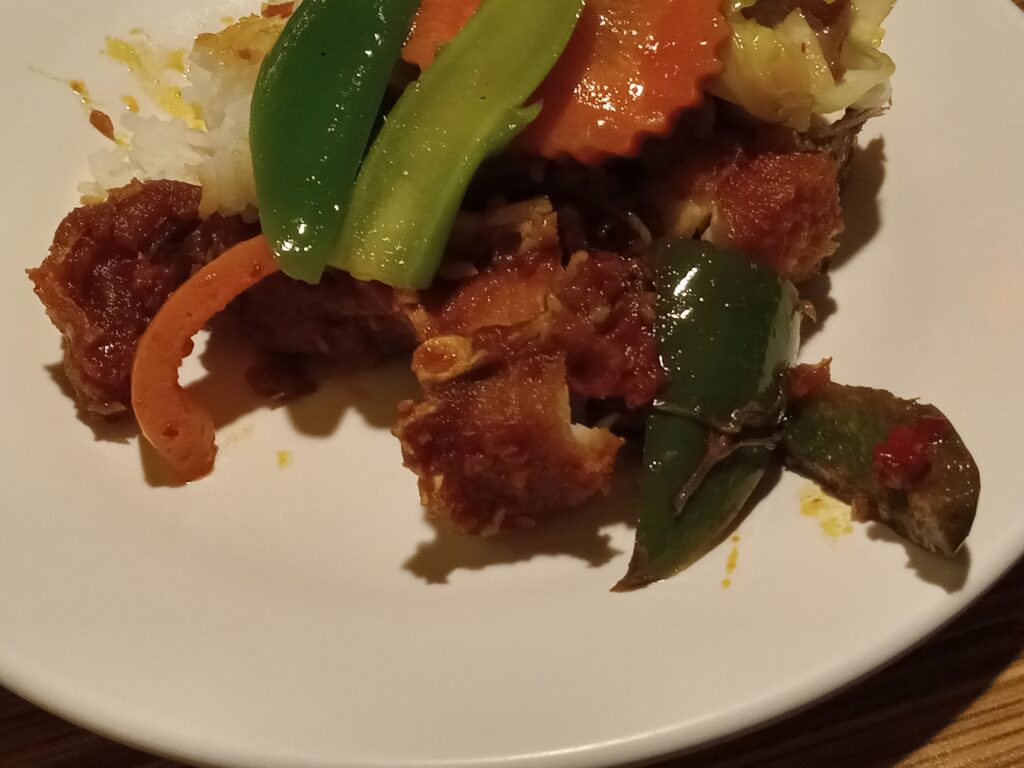 パプリカ入りの絶妙な甘辛ソースをまとわせて食べるお料理、
