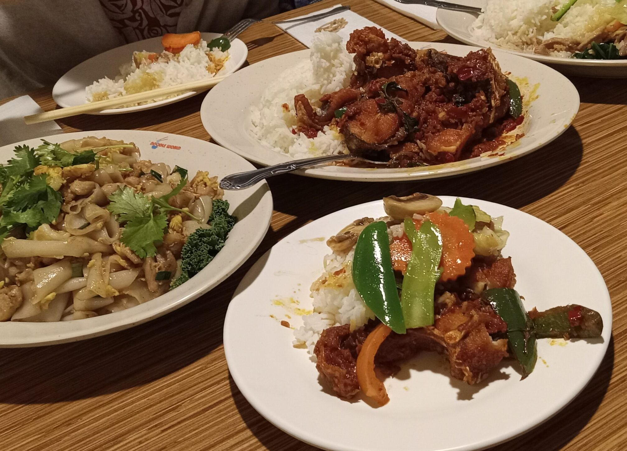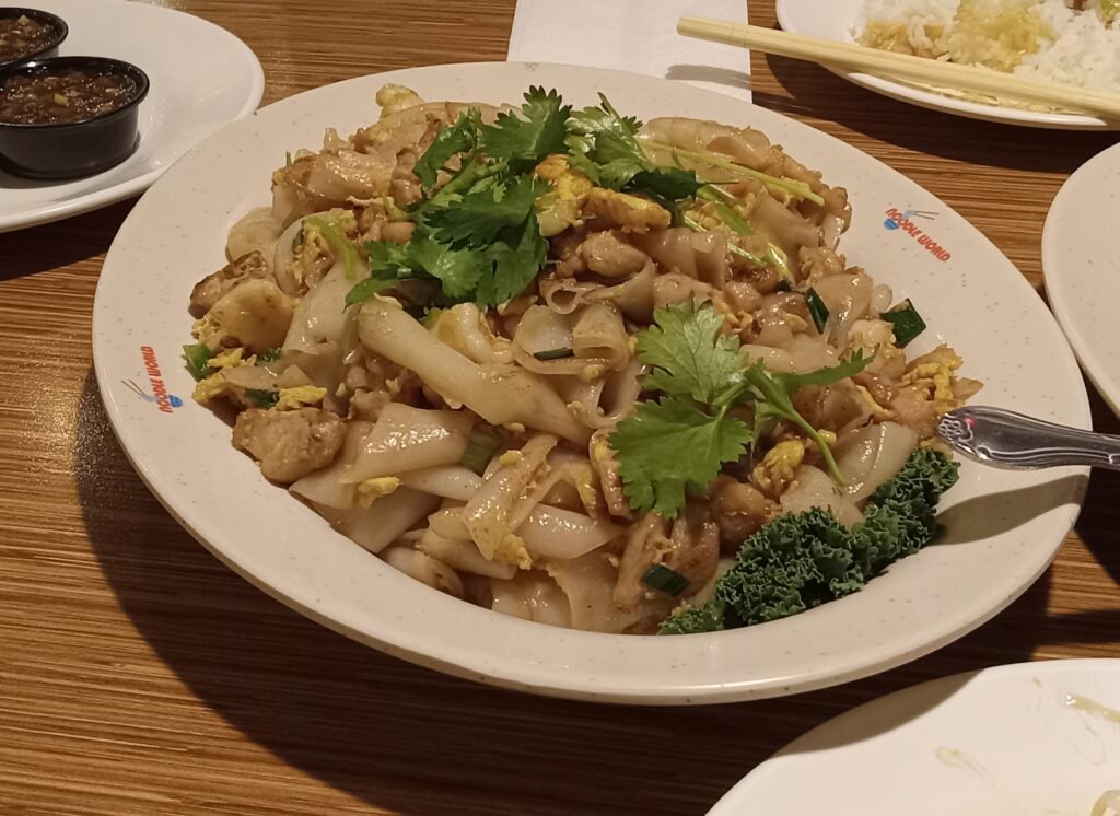 Noodle World, is a long-established, popular Thai/Asian noodle house for the masses. It seats over 250 people at once and is housed in a repurposed giant hamburger restaurant building, making it a hit with families and young groups.