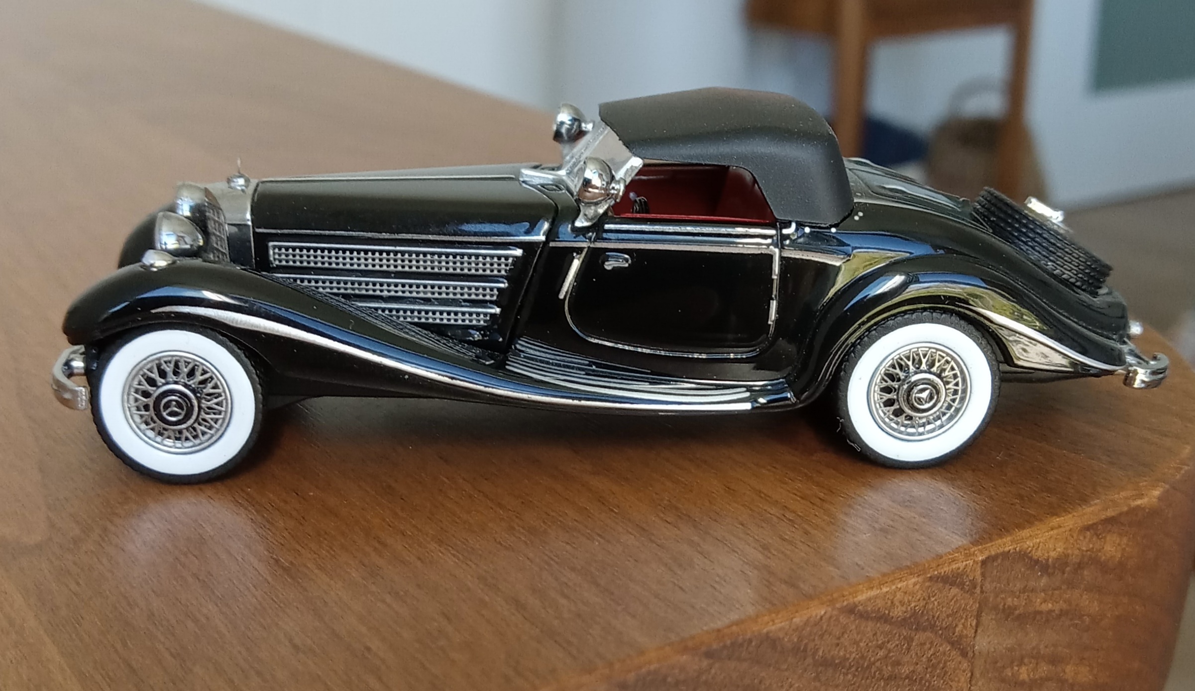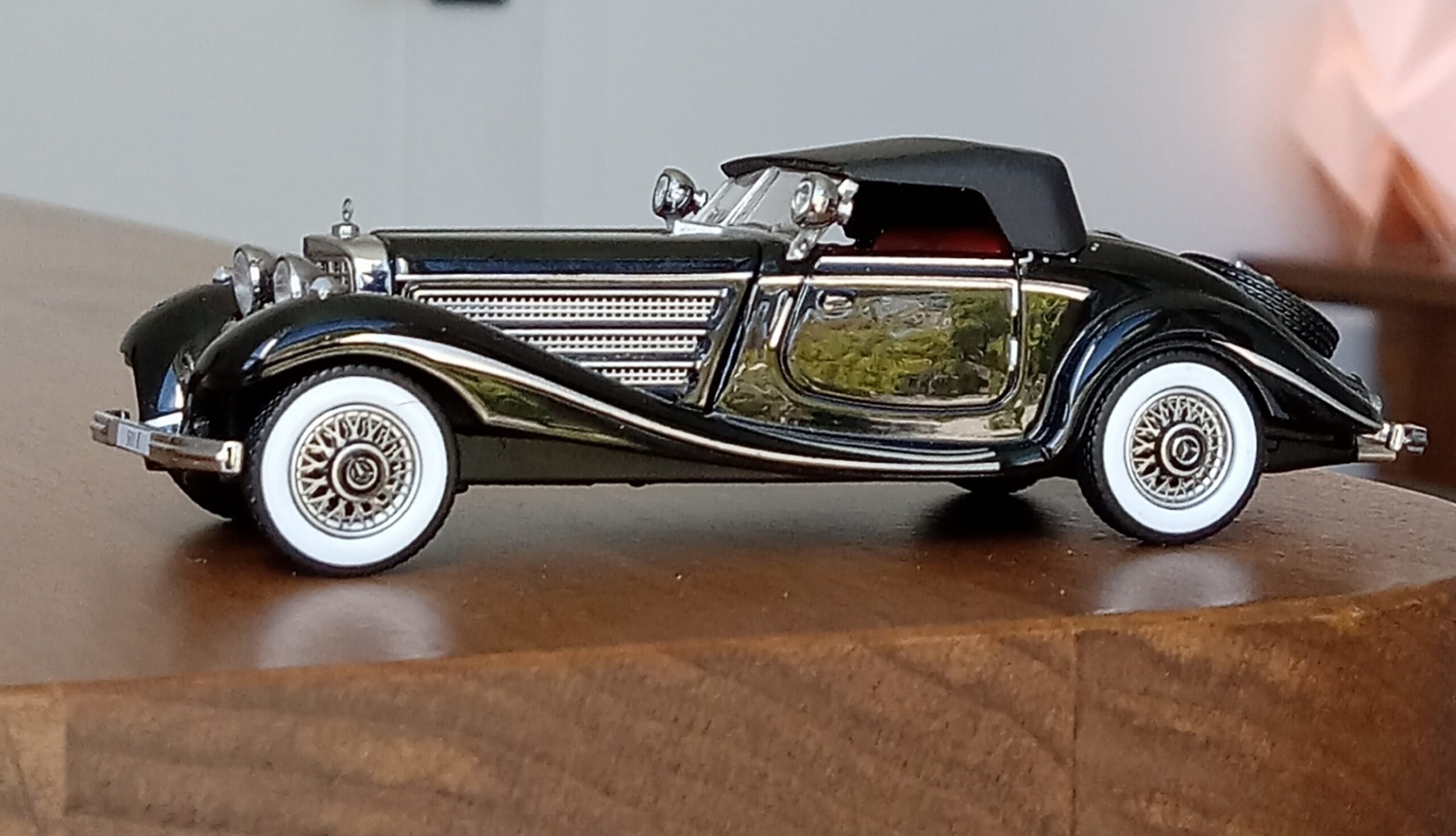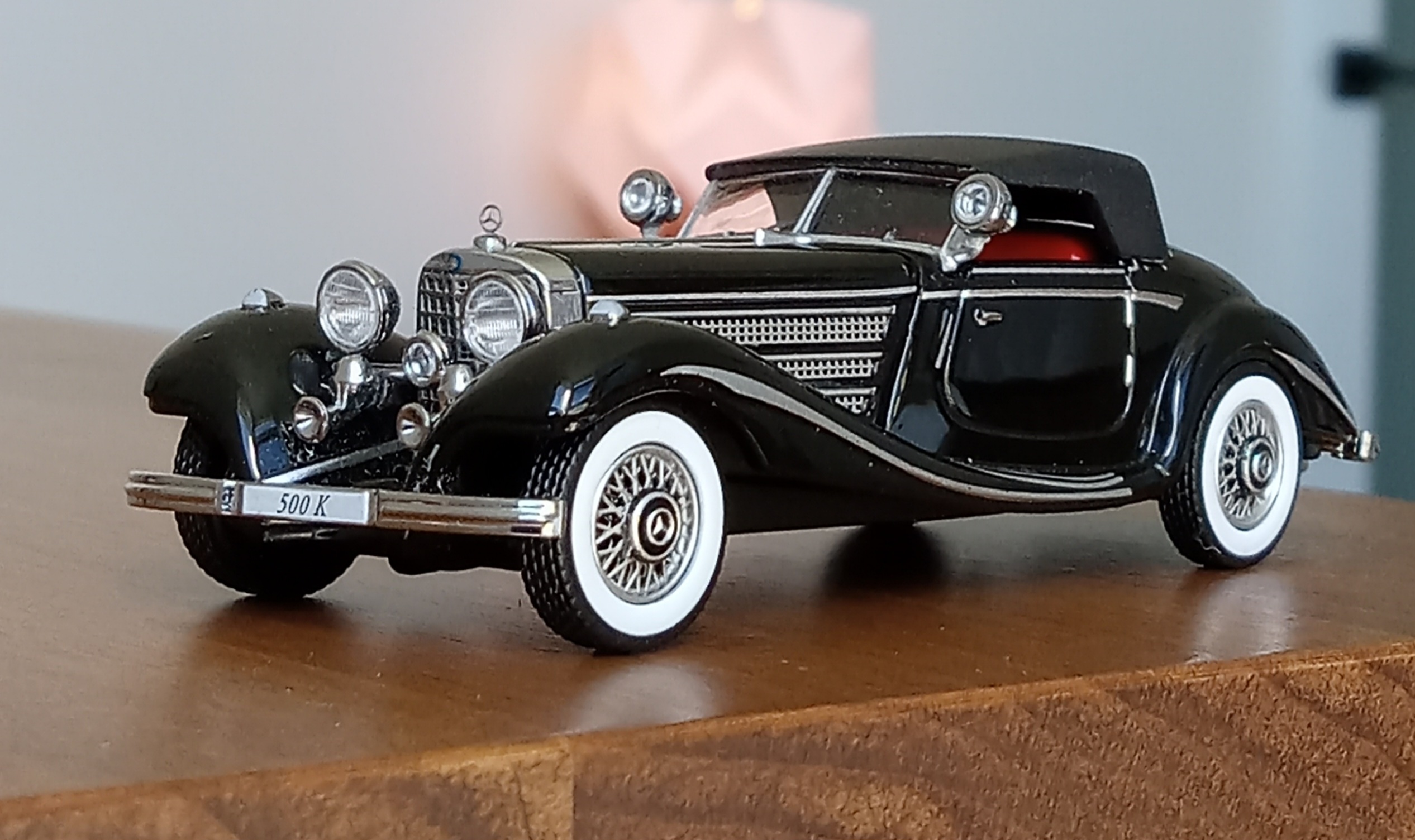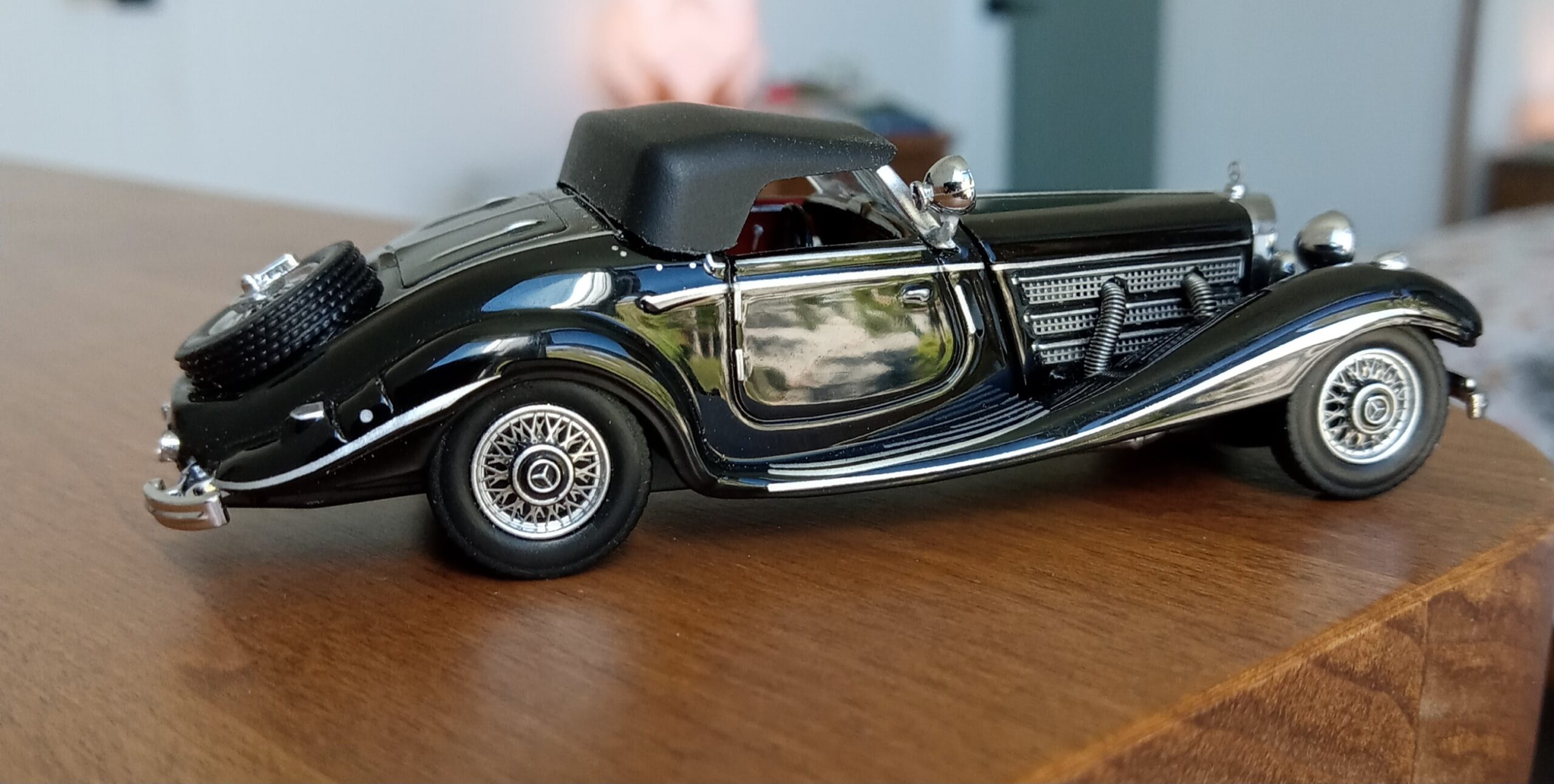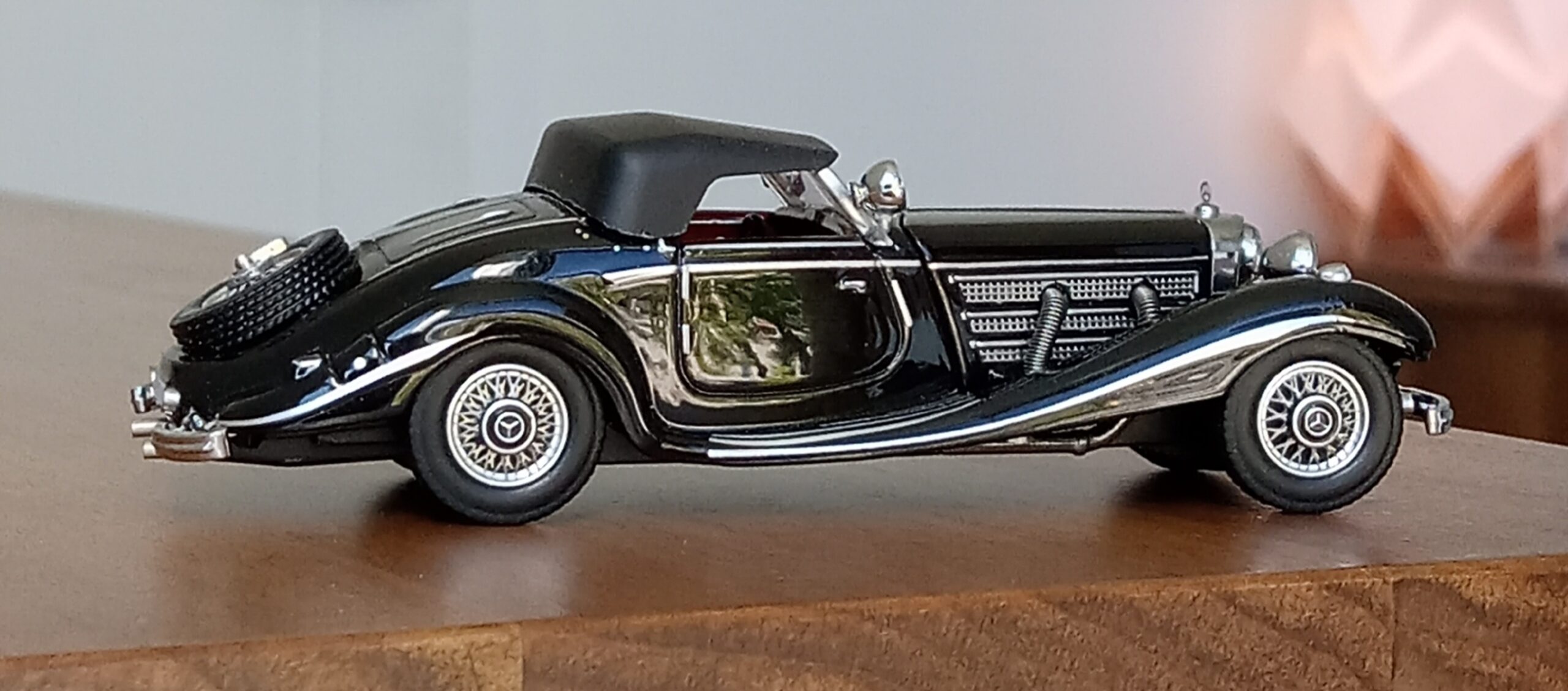 (撮影対象:リバティ―64社製、1/64 メルセデス・ベンツ500K スペシャル・ロードスター、1936(外装色:黒、内装色:赤)