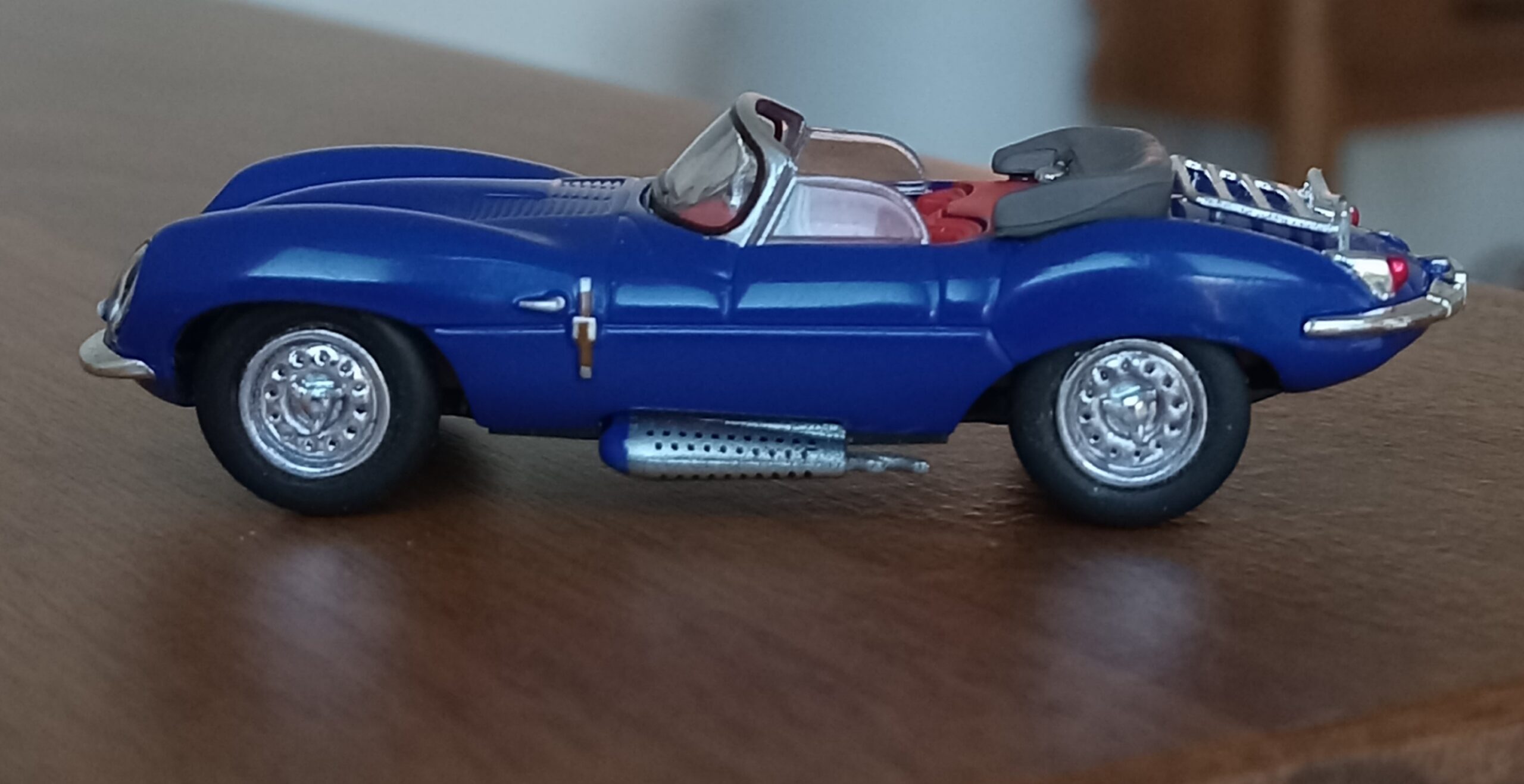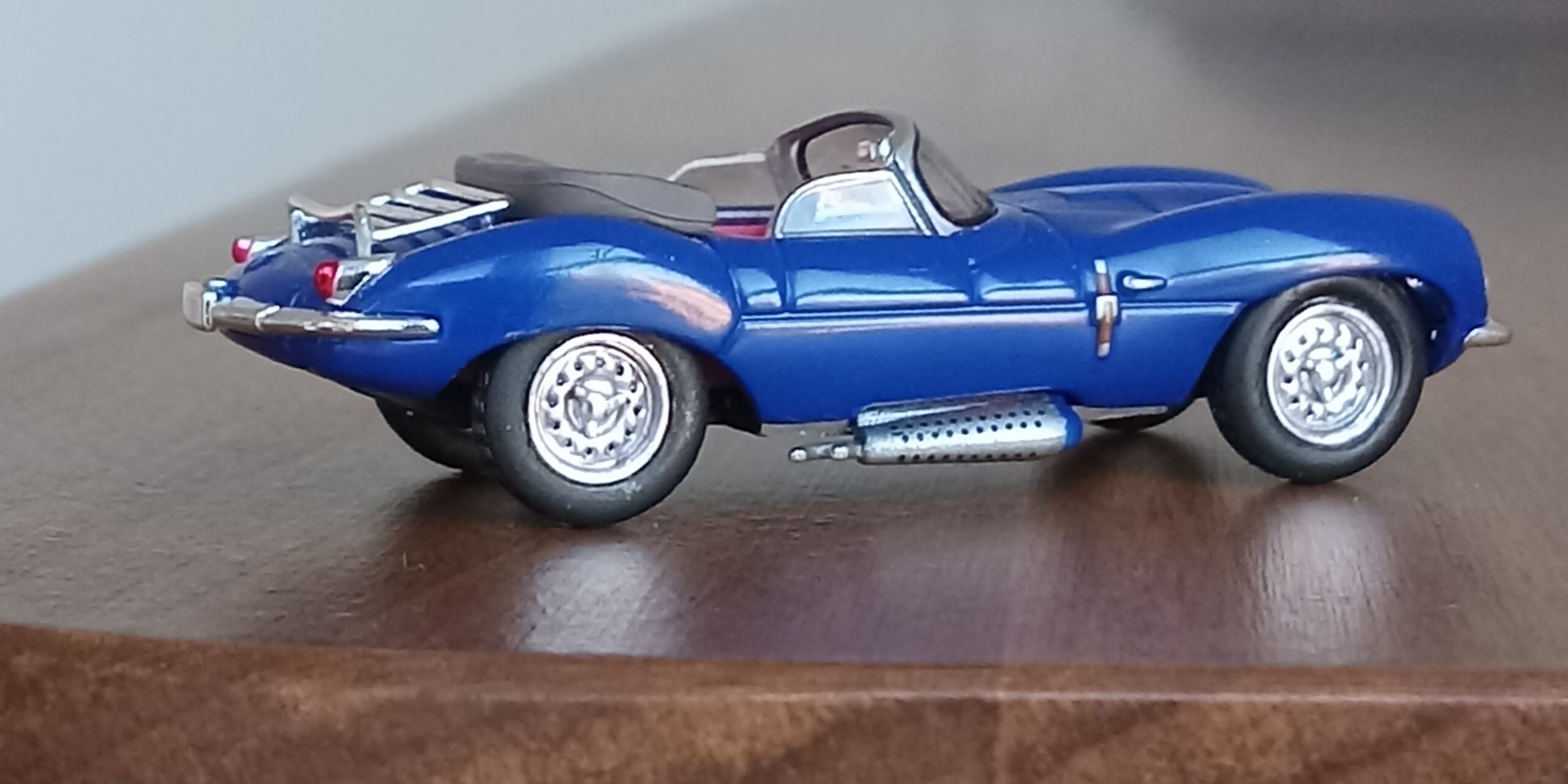 (使用模型:ブッシュ・リコー社製、1/87【HOスケール】ジャガー・XKSS【ロイヤル・ブルー】@改造箇所:車軸の位置と幅を微調整、ホイールの墨入れ)